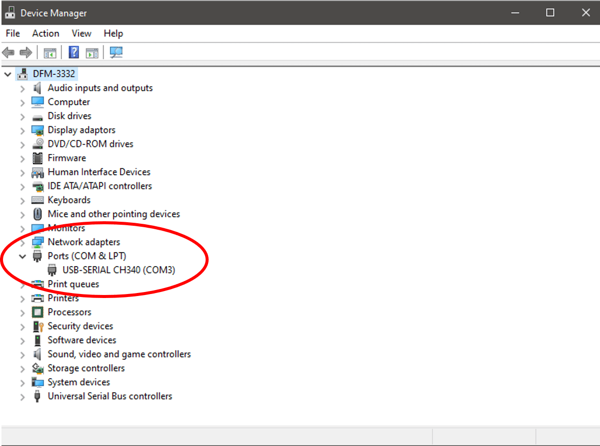 Når Arduinoenheden er forbundet til computeren skal enhedstypen (her Arduino/Genuino Uno) og COM porten (her COM 3) vælges i softwaren under fanebladet “Tools”. Man kan se COM porten i computerens “Device Manager” (se figuren herunder).
