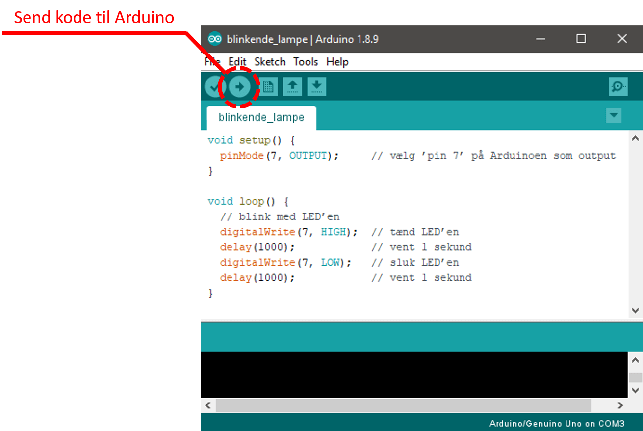 Når USB stikket er tilsluttet Arduinoenheden kan man uploade programmet til Arduinoen ved at klikke på det ikon der viser en pil der venter mod hørje.