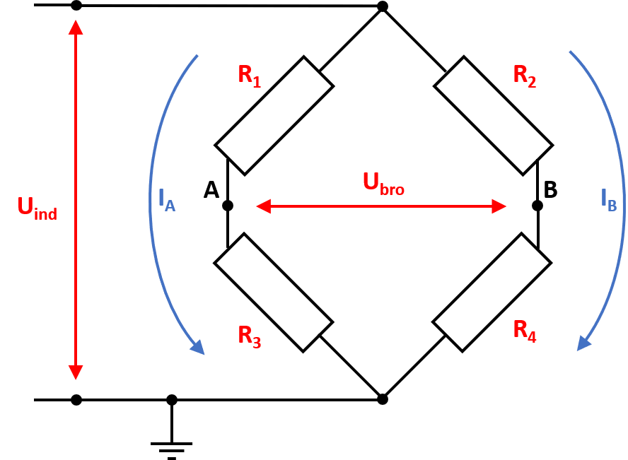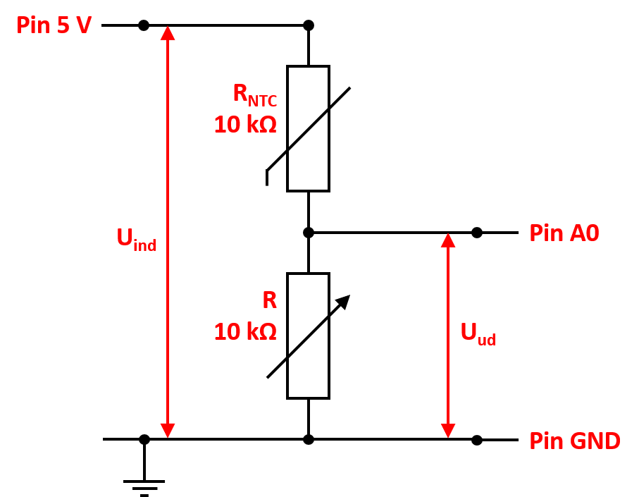 For at kunne måle en ændring i resistivitet i NTC termistoren forbindes den i spændingsdeler (se noter om spændingsdeleren) med en resistor, R, af lignende resistivitet. Udgangsspændingsfaldet er således givet ved spændingsdelerligningen.