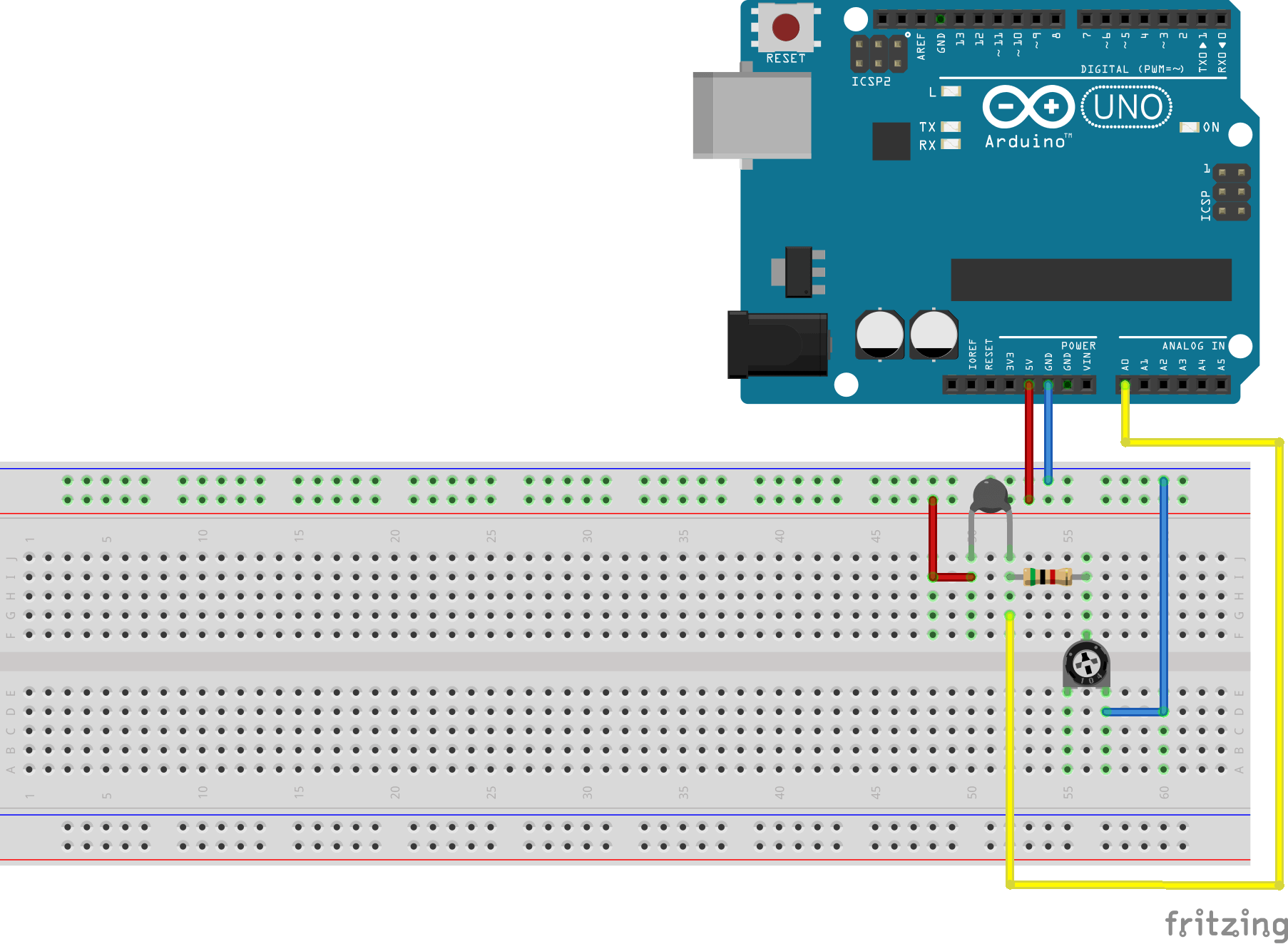 Men der kan dog være andre kilder til resistans i et kredsløb, eksempelvis i alle samlingerne mellem komponenterne, derfor vil den effektive resistans af modstandene i realiteten forekomme lidt højere end de 10 kΩ. For at kunne finindstille den præcise værdi, således at jeres termometer måler præcist i det temperaturinterval hvor det skal bruges kombineres en 5 kΩ resistor med en 0-10 kΩ variabel resistor (eller blot en variabel resistor med større spændvidde hvis en sådan er tilgængelig).