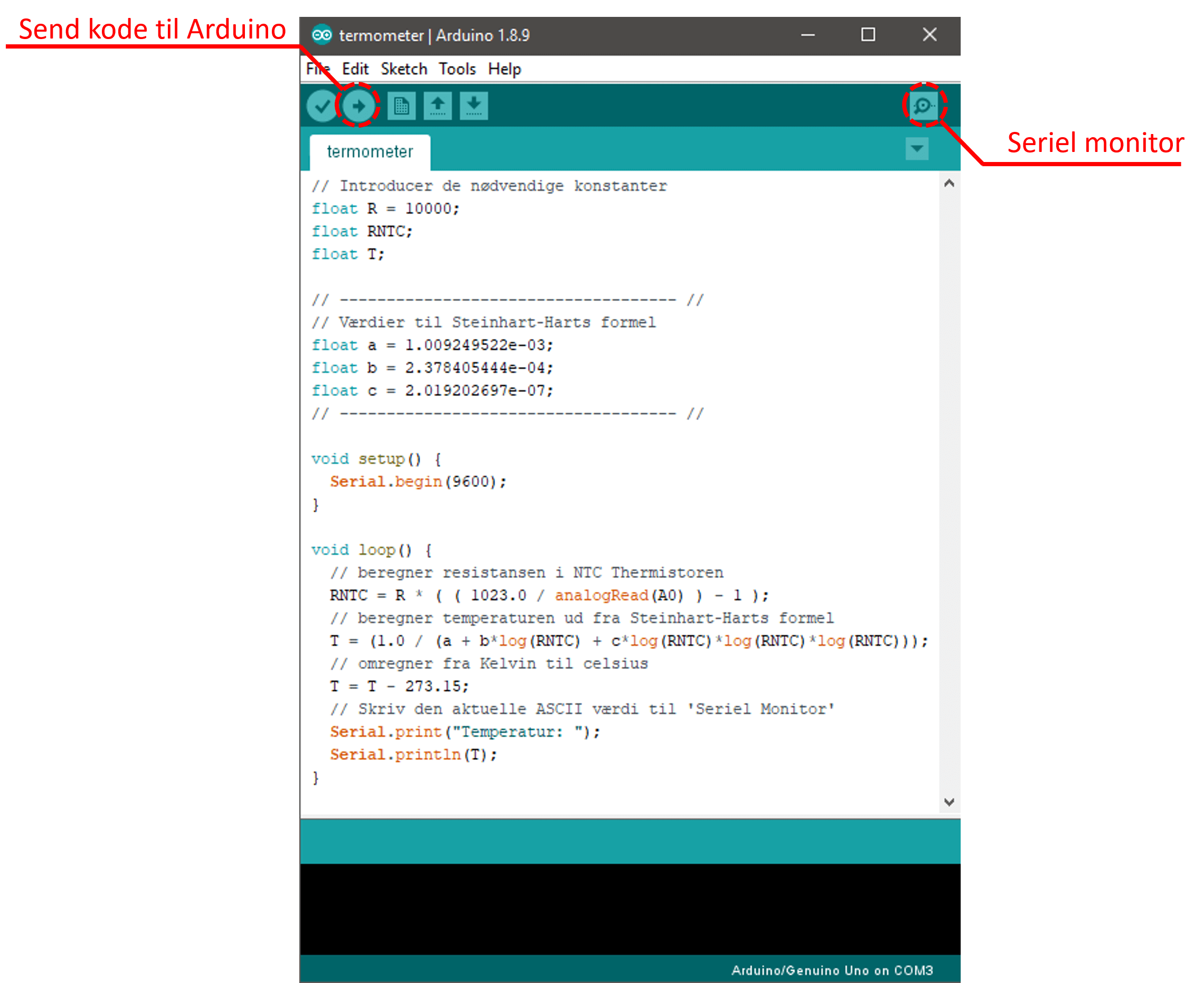 De kalibreringsværdier der er angivet i koden herunder, antager at man bruger en anden modstand der mancher termistoren men hvis man bare bruger en anden 10 kΩ resistor, vil de små forskelle i absolut resistans der naturligt vil forekomme, genrelt resulterer i en fejlbestemmelse af temperaturen. Dette kan umiddelbart afprøves ved at bestemme stuetemperaturen i rummet man bygger termometeret i, ved sammenligning med et almindeligt termometer man har liggende ved siden af. Derfor anbefales det at I laver en variabel resistor i området 5 kΩ til 15 kΩ ved at serieforbinde en 5 kΩ med en 10 kΩ variabel resistor.