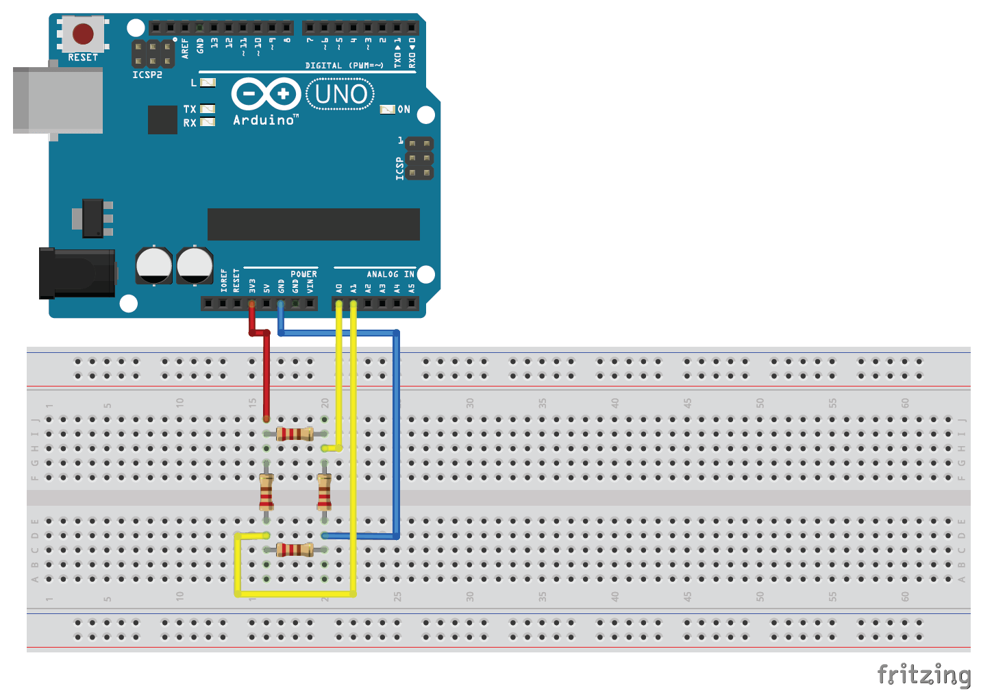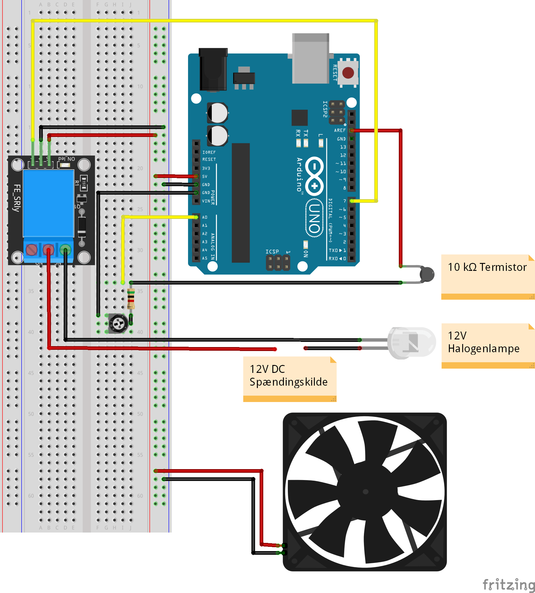 Spændingsdeleren bygges ved at NTC termistorens ene ben forbindes direkte til Arduinoens 5 V pin (rød forbindelse). Det andet ben forbindes til fumlebrættet. NTC termistoren skal forbindes i serie til den anden resistor i spændingsdeleren og til det analoge indput A0 på Arduinoen (gul forbindelse).