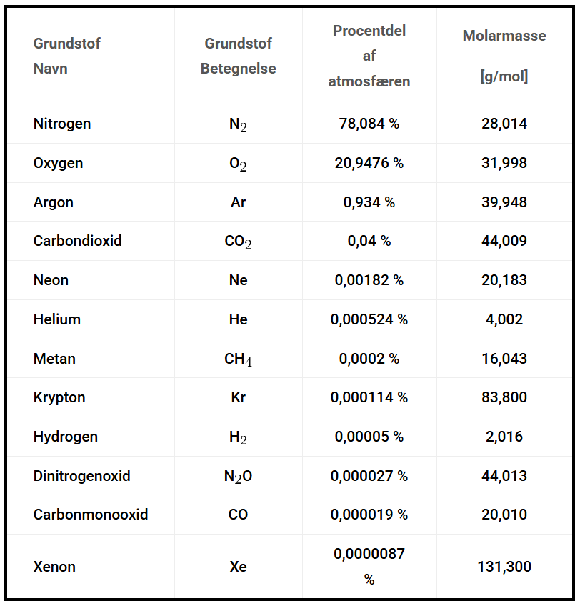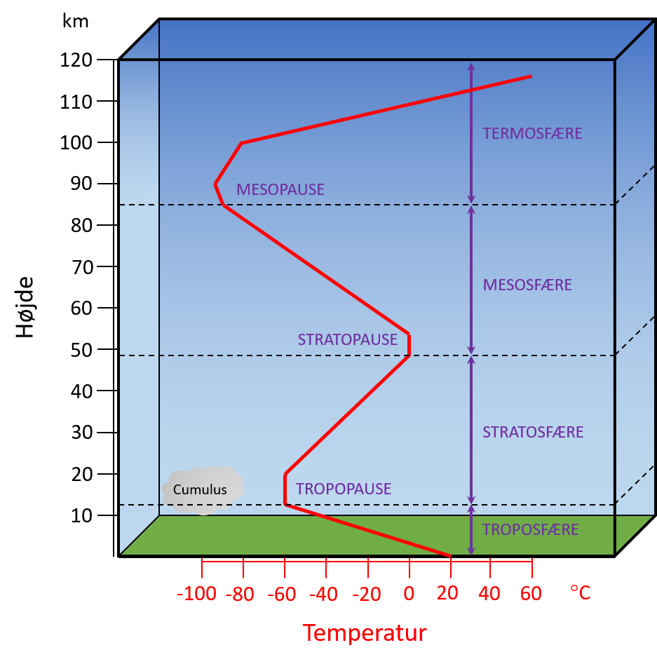 Det viser sig, at temperaturen varierer en del op gennem de forskellige lag af atmosfæren. Eksempelvis aftager temperaturen fra ca. 15 °C til omkring -55 °C i løbet af troposfæren. Troposfæren er ca. 11 km høj og er den del af atmosfæren der ligger tættest på jordoverfladen. Det meste der er skabs af os mennesker eksisterer således i troposfæren, selv kommercielle rutefly flyver typisk i grænselaget mellem troposfæren og den efterfølgende stratosfære. Figur 2 viser en grov skitse af opdelingen af atmosfæren i henholdsvis troposfæren, stratosfæren, mesosfæren og termosfæren og den tilknyttede udvikling i temperaturen.