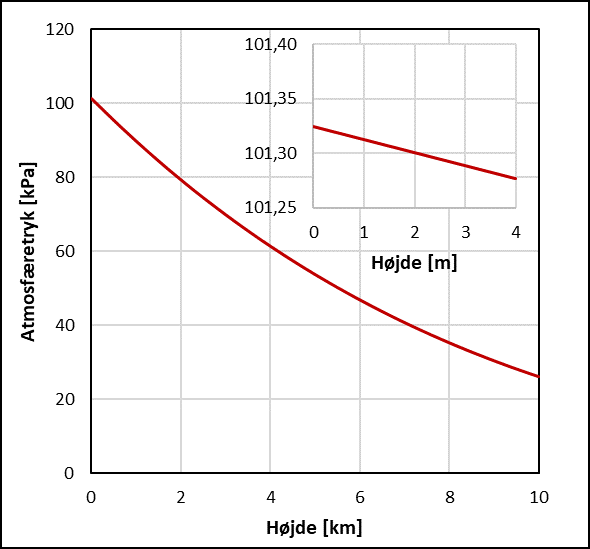 Atmosfæretrykket op igennem Troposfæren beregnes ved hjælp af ligning (5). Dette er vist på figur 3. Ligning (5) kan godt se lidt kompliceret ud. Heldigvis kan vi, så længe vi befinder os tæt ved jordoverfalden, med en god tilnærmelse antage, at trykket kan beskrives med en lineær tilnærmelse