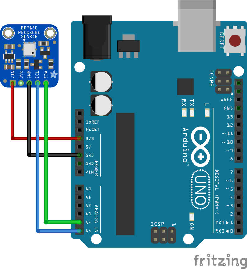 Selve trykmåleren sidder på et modul med følgende pins Vin, GND SCL SDA og 3.3, hvoraf kun de 4 første skal bruges. Dette vises på figur 4 til højre. Vin (hedder nogle gange Vcc) er modulets forsyningsspænding og skal forbindes til 3,3 V på Arduinoen, ligeledes forbindes GND (ground) til en GND på Arduinoen.