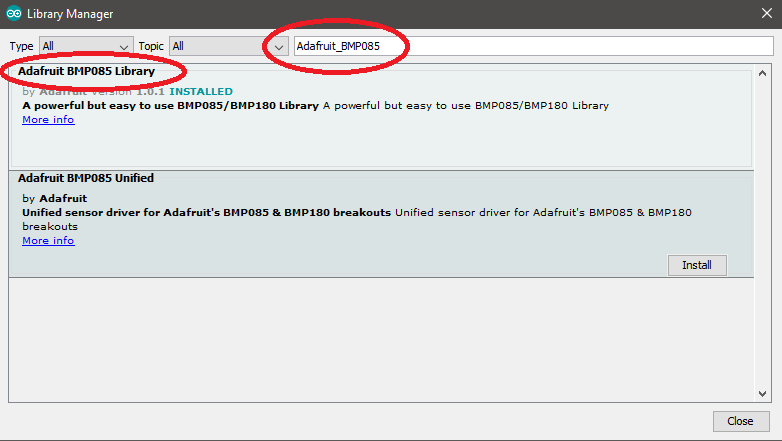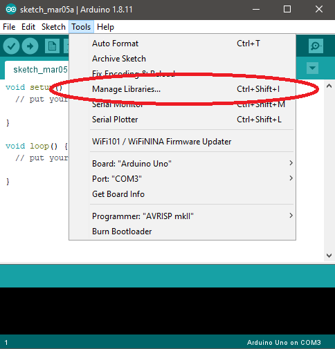 For at kunne benytte BMP180 sensorerne har fabrikanten leveret et bibliotek der håndterer selve kommunikationen mellem sensor og Arduino. Biblioteket skal hentes i Arduinoens ”Library Manager” som findes i ”Tools”-menuen, som det ses på figur 5 og 6.