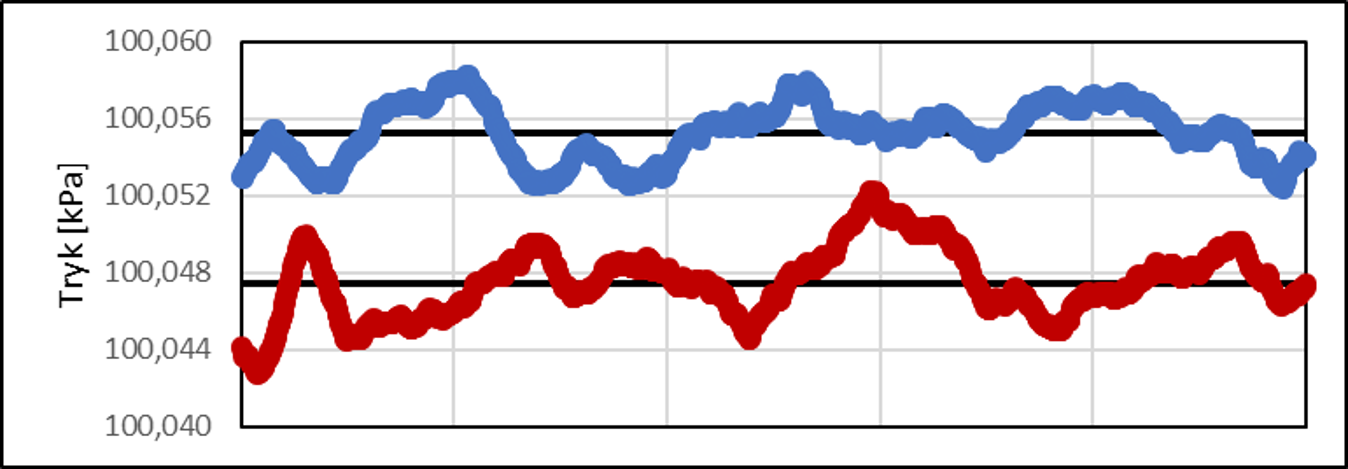Et af de vigtige bidrag til usikkerhedsbudgette for den højdemåler I netop har bygget er knytte til den tilfældige variation der er mellem målinger af tryk foretaget under sammen betingelser. Eksemplvis målinger foretaget lige efter hinanden. Det ses med det samme at målingen af højde ikke helt stabil. Figur 10 viser et eksempel på hvordan upræcise trykmålinger leder til usikkerheder i højdemålingen. Derfor må der, med dette billige udstyr, måles i et stykke tid og derefter mildes for at kunne bestemme en højde nogenlunde præcist. Derfor må der laves et usikkerhedsbudget.