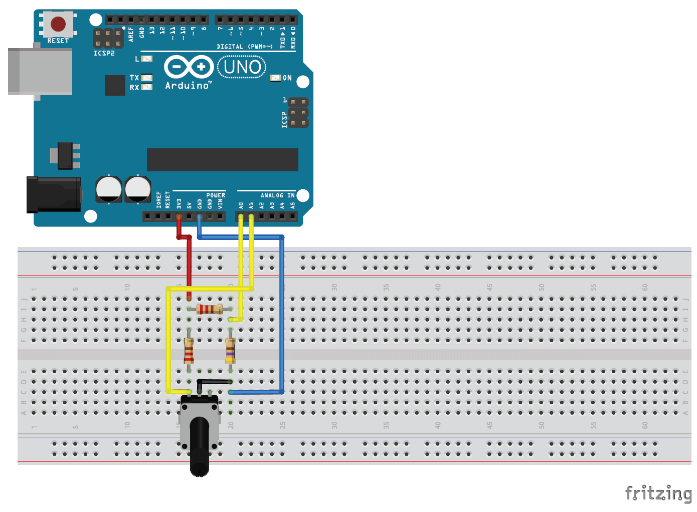 Efter den variable resistor føres en ledning tilbage til GND på Arduinoen.
