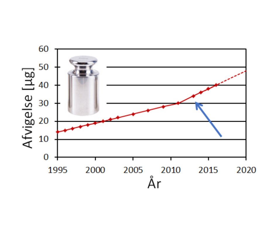 På figuren til venstre ses ændringen af masse af et lod over en årrække. Fra 1995 til 2003 bliver loddet kalibreret hvert år. Her ses det at afvigelsen fra den nominelle værdi stiger med 1 µg/år. Det bliver derfor besluttet kun at kalibrere loddet hvert andet år. I 2013 viser kalibreringen dog at loddet har taget mere på i vægt end forventet. Derfor sættes kalibreringsintervallet ned til 1 år igen.