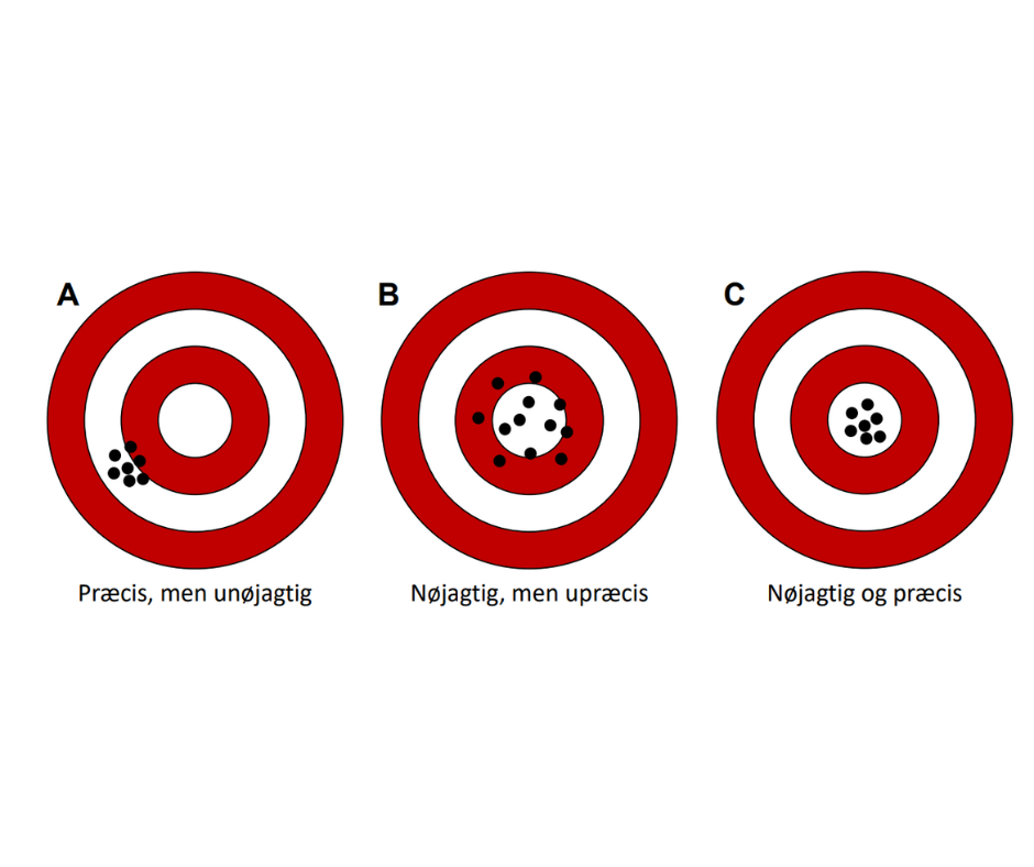 Kvaliteten af en måling vurderes ud fra præcision og nøjagtighed. Præcision beskriver, hvor ens gentagne målinger er, mens nøjagtighed angiver, hvor tæt de ligger på den sande værdi. På en skydeskive kan skuddene være præcise uden at ramme midten, nøjagtige men spredte, eller både præcise og nøjagtige. Præcision og nøjagtighed illustreres med skydeskiven til venstre: (A) præcis, men unøjagtig; (B) upræcis, men nøjagtig; (C) både præcis og nøjagtig.